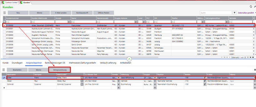 Garbit Standardberechnungsgrundlage: Hier wird entweder die E-Mail-Adresse aus dem zugeordneten Ansprechpartner, wenn nicht vorhanden, dann aus den Stammdaten / Reiter "Grundlagen" / E-Mail verwendet. Soweit beide E-Mail-Adressen vorhanden sind, wird nur eine genutzt (Ansprechpartner für die jeweilige Mahnstufe). Beispiel 1 (beide E-Mails vorhanden, auch Ansprechpartner zugeordnet): Stammdaten/Kommunikation (stammdaten@garbit.de) Ansprechpartner Mahnstufe 1 (ansprechpartner@garbit.de). Verwendete E-Mail in der Mahnung 1: ansprechpartner@garbit.de Begründung: Ein Ansprechpartner zugeordnet und eine E-mail dort hinterlegt. Beispiel 2 (nur eine E-Mail vorhanden, aber Ansprechpartner zugeordnet): Stammdaten/Kommunikation (stammdaten@garbit.de) Ansprechpartner Mahnstufe 1 (leer). Verwendete E-Mail in der Mahnung 1: stammdaten@garbit.de Begründung: Beispiel 3 (nur eine E-Mail vorhanden, kein Ansprechpartner zugeordnet): Stammdaten/Kommunikation (stammdaten@garbit.de) kein Ansprechpartner für die Mahnstufe 1 zugeordnet. Verwendete E-Mail in der Mahnung 1: stammdaten@garbit.de Begründung: