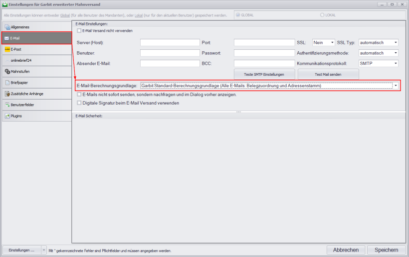 3. Welche E-Mail-Adresse beim Mahnversand verwendet wird, wird von der Regelung "E-Mail-Berechnungsgrundlage " in der App "Garbit erweiterter Mahnversand" festgelegt.